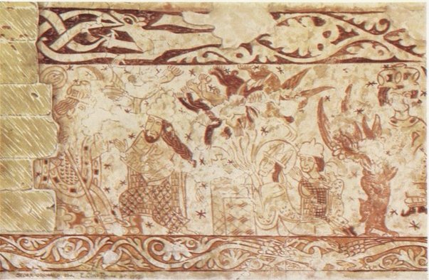 South Wall: The scenes as far as the 16th Century window have been lost except for a small part of the lower border.