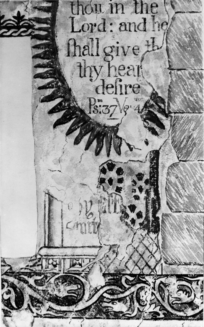 5. Finally in 1723 when the nave was renewed (the date of 1723 in plaster relief is seen in the ceiling) a further comprehensive series of TEXTS IN FRAMES and the HANOVERIAN ROYAL ARMS (over the chancel arch) were executed. Of this series five complete texts survive, with parts of three others, and the remains of the Royal Arms. Included in the last decoration, in an oval frame to the right of the south east window, a text from PSALM 37 “Delight thou in the Lord, and he shall give thee thy heart’s desire”. Also a text from the ACTS OF THE APOSTLES, almost unreadable, by the north door: “See here is water, what doth hinder me to be baptized?” Flanking the chancel arch are texts from THE REVELATION OF St JOHN and St JOHN’S GOSPEL.