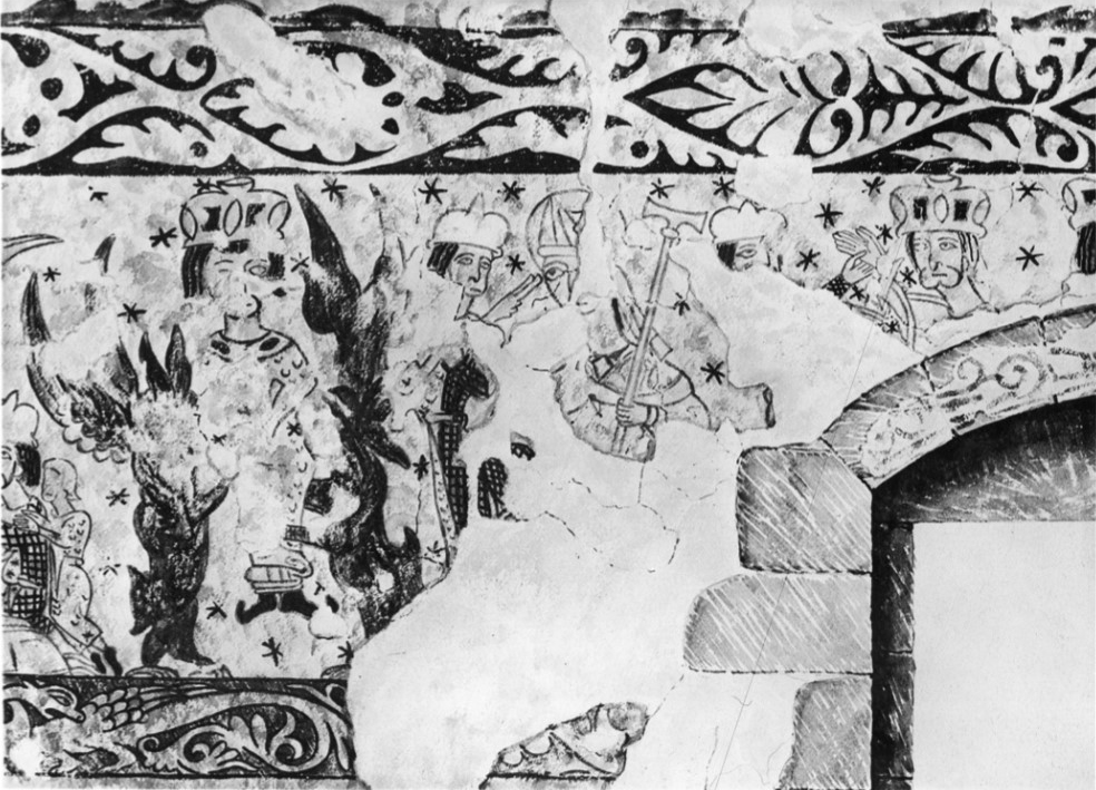 Facing Josias, to the right, is a commanding figure seated on an architectural throne. His horned head-dress is perhaps the most fantastic shown in the whole series of paintings; it is like a Byzantine crown. His straight hair is worn hanging to the shoulder. The cloak is fastened at the neck. Drapery of a lighter material falls in front of the right part of the throne.