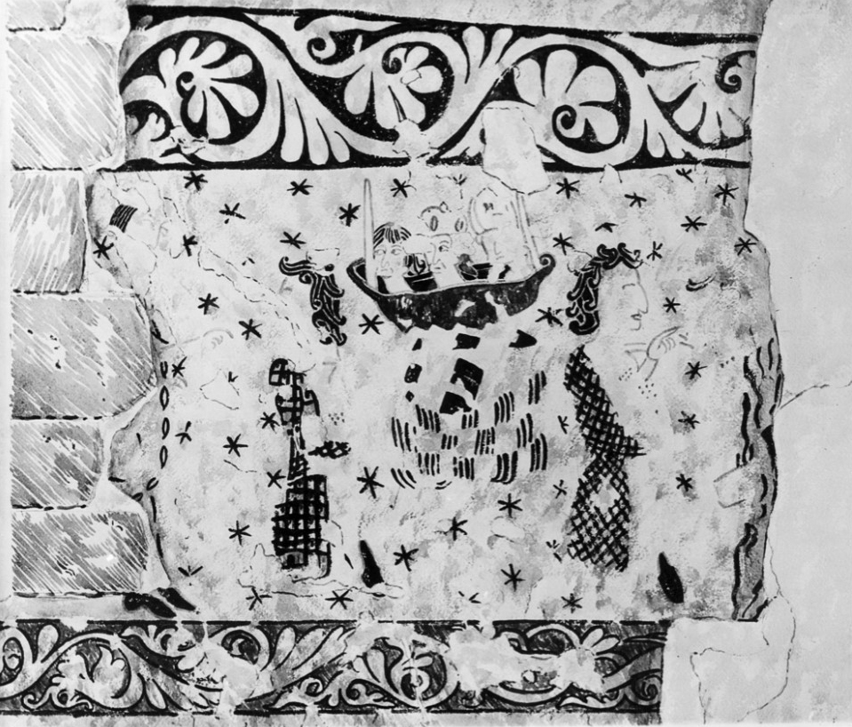In scene 7, there are breaks in the plaster, but it is possible to identify two figures in the centre; that on the right is clearly James, for a wears a mitre. With a tau-headed staff in his left hand he talks to Philetus, who is identified by his hat and chequered garments.