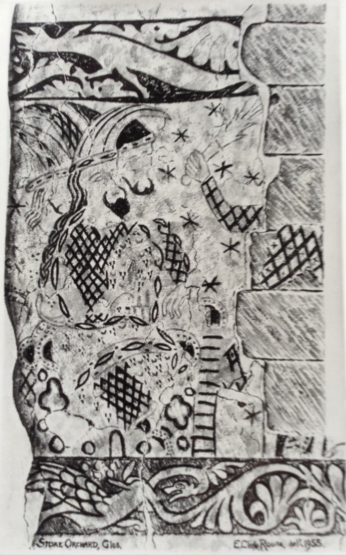 Thanks are due to the Royal Archaeological Institute for the reproduction of the painting by Clive Rouse and for the extensive use of photographs and notes from “Wall Paintings in Stoke Orchard Church, Gloucestershire” by E Clive Rouse and Audrey Baker, published by the Royal Archaeological Institute (May 1967).