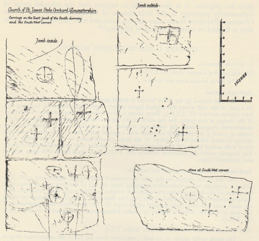 Constance Storrs (Jacobean pilgrims from England to St James of Compostela: from the early twelfth century to the late fifteenth century, London, 1994 p.162) shows that in 1314 William Archer, tenant of the manor at Stoke Orchard, may have visited the Jacobean capital; but did he visit as a pilgrim? It seems likely that Stoke Orchard, around 50 miles from the harbour of Bristol, became a ‘Halting Place’ for pilgrims travelling from Wales and the north of England to the burial site of St James at Compostela. We can imagine that the church, though at times a place of quiet, would have been quite different with the noisy throng of its ancient visitors. The scallop shell became the symbol of St James and of all pilgrims (pilgrims attached the shell on their hats as a badge of honour) and fittingly the wooden offertory plate of the church is in the shape of a scallop shell. Occasionally, today’s visitors to the church not only sign their names but may also say that they have been to the shrine at Compostela. Visitors in the past have done more than that, in that they have left small incised crosses in the jambs of the south doorway and at the north door, the south west corner and on the reused stone at the south east corner. Those fortunate enough to visit the church may wish to look for the crosses, and while by the North door view the unusual hinges with their dragon-like appearance.